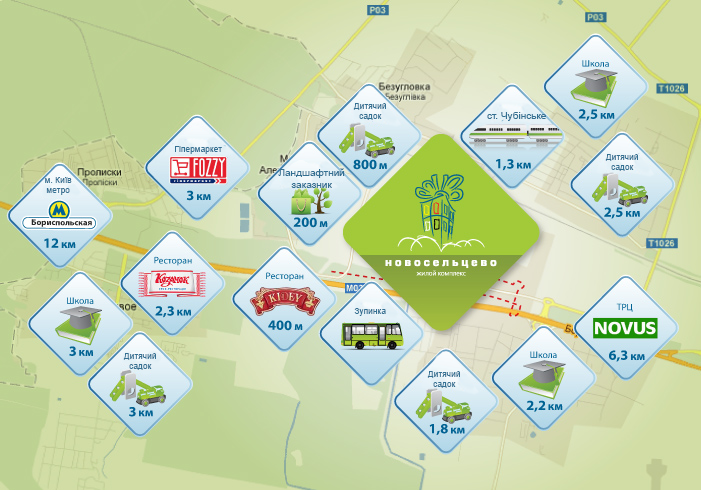Це заміський комплекс, розташований в 12 км від станції метро «Бориспільська» зі швидкісного автобану Київ - аеропорт «Бориспіль» в селищі Чубинське. Проїзд від метро до комплексу займає всього 10 хвилин. Селище Чубинське відноситься до рекреаційної зони.ЖК «Новосельцево» розташований поруч з державним заказником «Хутір Чубинського» зі 100-річними дубами, прекрасним водоймою і сосновим лісом.